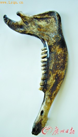 距今5300年至4200年的良渚文化以玉器闻名于世,良渚人全凭手工碾刻在玉器上的神人兽面纹堪称巧夺天工。近年来刻有良渚文化图案的骨雕偶有发现。笔者所见两件牙骨雕是同一动物的下颌骨,长达43厘米,估计是古代野牛的下颌骨,前端8只小牙已脱落,中间的牙齿保存完整。一侧刻有神人兽面纹,另一侧刻有数节简化神人兽面纹,刻画有神,纹饰精细。