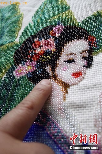 长春市民王玉珍女士用了3776442颗珠子绣成了一幅长达3.5米的“金陵[注: 金陵,南京的别称。全国重点文物保护单位,金代皇陵古墓葬。位于北京市房山区车厂村龙门口一带。半月形陵区,方圆七八十公里。金陵从主峰顺龙脉而下是陵区核心区,]十二钗”,珠子颜色总共99种。中新社发 李鸿劼 摄