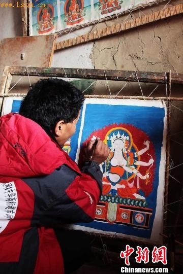 作为唐卡世家的传人,普布绘制的唐卡十分精美。