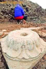在考古现场出土的一件石雕莲花座 (记者 崔健 摄)