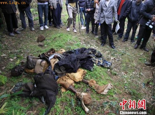 经现场调查,此墓建于清光绪8年,为四圹“凤”字墓,却均已被盗。其左边一圹保存有完整男性干尸一具,脚套官靴,蟒袍加身。遗憾的是已被盗墓贼拖出墓室,刨开部分衣物,体毛依稀可见。