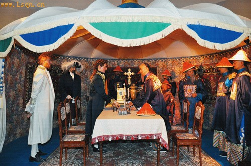 《尼布楚条约[注: 尼布楚条约(《尼布楚议界条约》)是大清帝国和俄罗斯帝国之间签定的第一份边界条约,也是中国和西方国家签定的第一份正式条约。]》签约现场模拟场景图,谈判桌左边是俄国御前大臣[注: 御前大臣 御前大臣:官名。清康熙间置。由王公大臣内特简兼充,无定员。掌乾清门侍卫、司员诸务,实际即统辖内廷事务,并常日侍直于皇帝左右,逢皇帝出宫巡幸,与领侍卫内大臣任后扈大臣。]戈洛文,右边是清朝领侍卫内大臣[注: 领侍卫内大臣清官名。清代制度,设“侍卫处”领侍卫内大臣是皇帝贴身警卫的指挥、调度人,领侍卫内大臣是正一品 ,“建威将军、]索额图