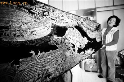 在昌平[注: 昌平是首都北京的北大门,位于北京西北部,被称为“密尔王室,股胧重地”。素有“京师之枕”美称。古有居庸关、龙虎台等险隘以及明代陵寝,今是首都卫星城。]居民刘宝翠的手中,嗑完的瓜子皮也能作画。创作瓜子画要从一堆瓜子皮中,选出大小、颜色、纹路都合适的几片,拼接成一个部位,粘贴到布面上,之后再继续寻找适合下一个部位的原材料……全部完成后,再将布面粘贴到铝塑板上定型。历经两年,她把《清明上河图》分成6个部分陆续制作,总长12米的瓜子皮粘贴画《清明上河图》终于完成。