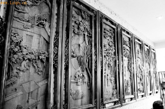 在木雕制品店西侧的墙上,有一组八幅条屏深深吸引着众多参观者的目光,更有手机达人纷纷拍照频刷微博。