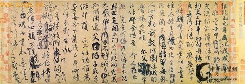 《祭侄文稿》行草墨迹,颜真卿书。此帖本是颜真卿为自己的侄子写的一篇祭文草稿,他的侄子季明为叛军安禄山[注: 安禄山(703—757)营州(今辽宁朝阳)人,其父可能是康姓胡人,母阿史德氏是个突厥巫婆。相传,其母多年不生育,便去祈祷扎荦山(突厥尊扎荦山为战斗之神),]所残杀。这件作品原不是作为书法作品来写的,由于心情极度悲愤,情绪已难以平静,错桀之处增多,时有涂抹,但正因为如此,此幅字写得凝重峻涩而又神采飞,笔势圆润雄奇,姿态横生,纯以神写,得自然之妙。