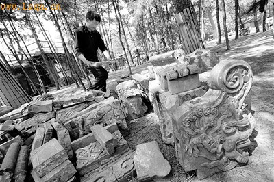 施工人员将圈洞内城砖、琉璃椽子及筒瓦等物品清理到院子里 摄/记者 蒋桂佳