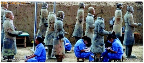 6月9日是第七个中国文化遗产日,本报记者跟随挖掘队深入秦始皇帝[注: 秦始皇-秦始皇(公元前259---公元前210年),姓嬴,名政,生于邯郸(今属河北)。 秦朝建立者、杰出的政治家、军事统帅。]陵博物院考古现场,探访了秦兵马俑一号坑和秦始皇陵9901陪葬坑“百戏俑”考古发掘的情况。