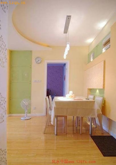 装潢 家庭的能量部分来自於进餐的食物。由於餐厅是进食的区域,所以跟家庭的财富大有关系。餐厅应采用亮色的装潢和明亮的照明,以增加火行的能量,蓄积阳气。在此处放置植物更可增强阳气和财富。