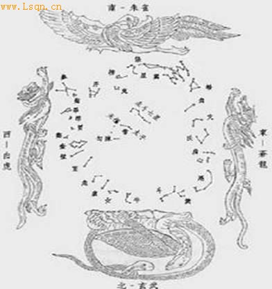 二十八宿在东巴活动中是用来作星相占卜用的。汉族的二十八宿在天象及方位的观测上分为四组,分别用四象中的东方苍龙,西方白虎,南方朱雀,北方玄武来表示,如图-2: