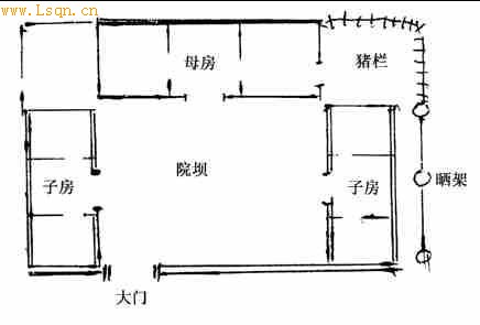 过,纳西族的上方和下方概念,是由水的流向决定的。在山区建房,水源头自然是上方,水尾为下方。如依北山而建的“木楞房”,上方为北;依西山而建的,上方为西;依东山而建的,上方为东;依南山而建的,上方为南。这种方位多少带有点立体的意味。母房的两侧建有两幢子房,子房一般为三间平房。左首子房为地搂,楼下是牲口圈,楼上为子女住房;右侧的子房作堆放工具用。大门开在右侧子房山墙的左侧,用土墙与地楼山墙相连。地楼的门朝屋外开,门外是一块平场,四周用木栏围住,内设粮食晒架,或围以猪栏、羊栏。这样就构成纳西族典型的木楞房院落,木楞房院落平面结构,如图-5所示:
