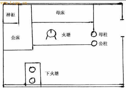 母屋是山区纳西族一家人生活和议事的中心。屋中的设施典型的代表了纳西族的信仰习俗。母屋,纳西语称为“吉美”。地中央有两根柱子,纳西语称为“美都”,意为撑天柱或公母柱。其中的一根柱子代表男性,一根柱子代表女性。男柱顶住屋梁,女柱稍短,不顶梁。女柱的柱头上置一标志六畜灵魂的“闹”篓,内放标志六畜的神石、神木。房屋的前檐覆盖9块木板瓦,后檐覆盖7块木板瓦,表示男九女七的俗信数字。公母柱的前面建火塘和床。柱子正面一侧为公床(男床),公床左侧为母床(女床)。公床与母床交接的角落设神柜,神柜上方的墙上设一本架(俗名“猫儿桥”)。木架上供奉象征这个家庭成员集体的灵魂篓“格古鲁”。母房的设施如图-6所示: