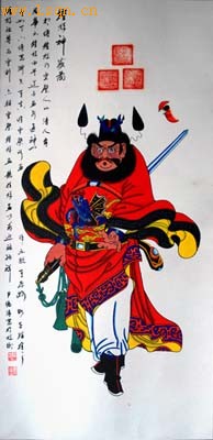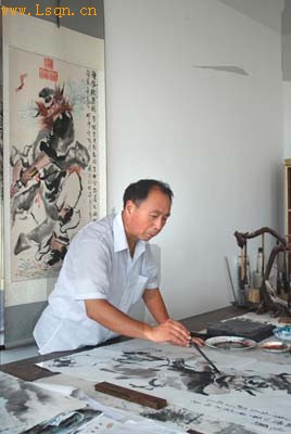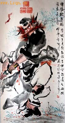 钟馗画作品1 钟馗画作品2 在中国泱泱五千年的文明史中,以某种艺术为载体,寄托和表达人民大众的情思和祈愿,乃中国民间艺术的主要表现形式,或曰中国民间艺术的主脉络。传承了1000多年的灵壁钟馗文化,就是中国民间艺术长河中的一脉。 向有“天下奇石第一”称誉的安徽省灵壁县,地处淮北偏东南的淮河流域。历史上长期受水旱蝗灾袭扰。旧《灵壁县志》载:居民“岁岁逃亡,十不存五”。在新中国成立之前的漫长历史时期,与灾荒年众多民众长期逃荒流离有关,民间多出艺人,如杂技、曲艺、木偶戏、皮影戏等,以为生计。其中,在民间影响力最为广泛、最具民俗文化价值的当属钟馗文化。目前,楚汉文化、灵璧奇石、钟馗画已逐渐形成三元文化产业链,并称灵璧三绝。 非物质文化遗产安徽灵壁钟馗画传承人孙淮滨 因在中国独树一帜的钟馗画,2003年灵壁县被国务院文化部授予“中国民间艺术之乡(钟馗画)”称号。继之,2006年5月,灵璧钟馗画又被列入安徽省首批非物质文化遗产名录。灵壁县原县文化馆馆长、钟馗画资深老画师孙淮滨先生,被指命为该非物质文化遗产项目的传承人。2007年8月在中国“第四届民间艺术博览会中国创造·民间文化品牌评选活动”中,也曾授予孙淮滨先生“中国创造·民间文化品牌艺术家”称号;其选送作品获得“中国创造·民间文化品牌珍贵艺术品”荣誉。中国的钟馗画,一般特指安徽省灵璧县所绘钟馗画像,上古以来传说可以镇邪消灾。旧时并认为上方要加盖篆印“灵璧县印”方才有效。故而灵壁钟馗画在章法上追求地方传统特色,在画面上方加盖三方篆印,形成一个正品字,此“品”字即贡品的标志。后来他地的钟馗画家纷纷效仿,流传既久,渐成型制,成为灵璧钟馗画独有的标志。 民间相传钟馗捉鬼的故事,家喻户晓,更敷演出钟馗为灵璧人,灵璧所绘钟馗才是其本像的写真,并有每年出一张“活钟馗”的说法。而这一说法在古籍里也得以验证。清初著名学者金植在其所著《不下带编》中曾记载:“钟(馗)乃灵璧人,至今后裔在焉,多以丹砂绘其祖像而货以资食。上有县篆者,尤灵应云”。 灵壁资深画家刘学在作画 至于钟馗之说,初见于唐朝张说《谢赐钟馗及历日表》所云:“中使至,奉宣圣旨,赐画钟馗一及新历日一轴……屏祛群厉,馈神象以无邪……”。由此而知,钟馗图最初随历日表由长安皇宫大内颁发。为“驱除群厉”,到了玄宗时,吴道子始画捉鬼图,五代杭州吴越王沿袭上代故事,除夕日由画工绘钟馗击鬼图。至宋代,钟馗已不再是皇家颁发于臣属之物,寻常百姓亦“岁首贴钟馗于门”。随着时代的发展,人们逐渐把钟馗人格化,使其神威减退,人情味加强,象钟馗醉酒、送子图、嫁妹图等,其神话传说的色彩日益淡漠,甚至称钟馗为"髯君"、"髯者"。 灵璧钟馗画盖以手工绘画形式出品为主,迄今历久不衰。画中的钟馗头戴乌纱,身着官袍,有一股阳刚凛然之气,被世人誉称为“判子”、“灵判”,是深受当地历史传统文化影响而形成的。据历史传:“玉帝对钟馗刚烈不屈的性格非常赞赏,下聘书命为“阴阳两界的判[1] [2] [3] [4] [5] 下一页