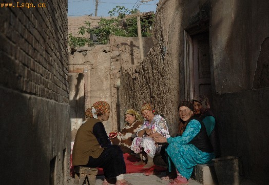 丈夫在艾提尕尔清真寺门前的巴扎做生意,她和巷子里别的妇女一样,不用工作,在家呆着就行。白天女人们聚在空荡荡的巷子里,或是某家的门口,做针线活、聊天、带孩子。一些戴头盖(喀什老城特有的,盖住整个头部的褐色的厚厚网状头巾)的老年妇女会在这个时候掀起头巾露出脸,或是换上只遮住头发的薄头巾。