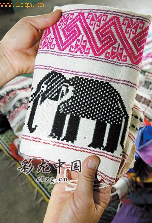 玉金海拿出象征五谷丰登的大象图案织锦。记者 曲鸣飞/摄