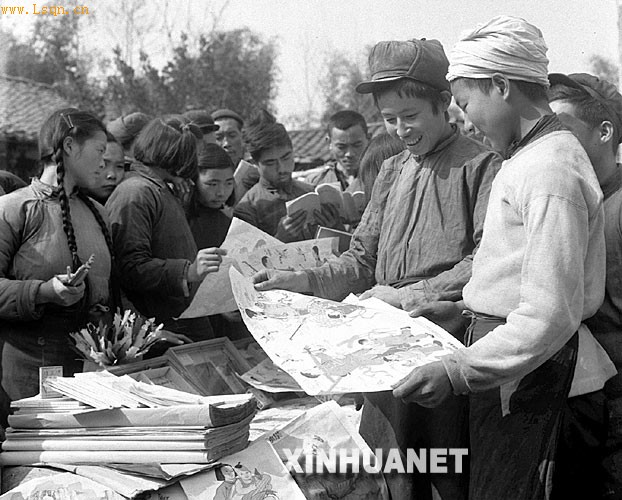 1956年春节前夕,四川双流县彭镇供销合作社的流动推销小组把大批年画及文具用品送到农村。这是彭镇乡第一高级农业社的社员们正在购买年画。 新华社发