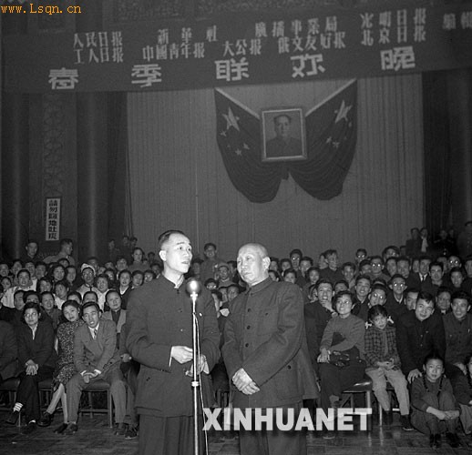 1956年春节,《人民日报》、新华社、广播事业局、《光明日报》、《工人日报》、《中国青年报》、《大公报》、《俄文友好报》、《北京日报》编辑部联合举办联欢会。图为相声演员侯宝林、郭启儒在晚会上表演相声。 新华社发