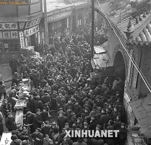 1957年春节期间的上海街头。扯铃摊上发出一片嗡嗡声,吸引了不少小顾客。