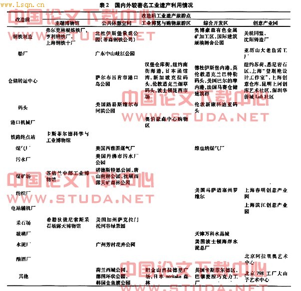 料价值和派生的文化情感上进行成功的再利用也是一种保持人们对城市历史性特征的体验方式。因此,在对工业废弃地不断改造利用过程中,出现了利用景观的手段和途径来解决再利用的问题这一大胆尝试;尽管此类景观的出现原因可能涉及多个方面,但工业废弃地的产生无疑为后工业景观的产生提供了必要的物质条件。 三、工业遗产、工业遗产旅游与后工业景观 “工业遗产”是指工业文化的遗存,具有历史的、技术的、社会的、建筑的或科学的价值。这些遗存包括建筑群与机器、车间、工场和工厂、矿山与处理与提炼遗址、货栈与仓库、能源产生、输送与使用的遗址、交通及所有其基础,以及用于有关工业社会活动(诸如居住、宗教信仰或教育)的遗址。它是工业废弃地的一部分。 工业遗产旅游(industrial heritage tourism)是在废弃的工业旧址上,通过保护和再利用原有的工业机器、生产设备、厂房建筑等,改造成的一种能够吸引现代人们了解工业文化和文明,同时具有独特的观光、体闲和旅游功能的新方式。它起源于英国,随后在德国、美国、加拿大、日本等地获得迅速发展,是一种从工业考古(industrial archaelogy)、工业遗产的保护而发展起来的新的旅游形式。[6]在西方,工业遗产旅游真正大规模展开是从20世纪80年代初的遗产旅游开始的。遗产旅游(heritage tourism)是一个非常普遍的说法,其含义与我国的历史文化和文物古迹的旅游观光相当。在当时,英国、德国等已迈向后工业社会的国家在对衰退地区考察研究以后,提出对工业遗产进行保护的同时,开发工业遗产旅游,希望通过工业遗产旅游项目的开发,从而更好地处理工业废弃地和解决传统工业区衰退问题。德国成功转型的鲁尔地区,英国著名的铁桥峡谷,都是在老工业基地衰退的同时,利用其特殊的旅游资源,开展了颇具特色的工业遗产旅游。其中,后工业景观作为工业遗产保护开发旅游的一项重要手段,一种公共游憩模式(表2)而被运用[7],可以说工业遗产旅游的开展极大地促进了后工业景观的发展。  四、结语 时代的发展带动新的价值观念的出现,而新的价值观念的发展又带动社会各层面的相应转变,这也直接影响着设计过程中所遵循的一系列原则,直接影响着景观设计作品本身的时代内涵。作为后工业时代一种景观类别,后工业景观在其产生之初就注定了其规划设计的复杂性和解决问题的综合性。它伴随着时代发展而产生,伴随工业废弃地的改造利用而逐渐兴起,其特殊的品质和散发出的独特工业文化内涵越来越得到认可。尤其在随着工业遗产旅游资源的成功开发,后工业景观作为一种公共游憩地而被开发,成为工业废弃地复兴的方法之一,引人关注。但是在我国,由于工业化起步较晚,后工业景观对于我们还是一个较新的名词。一方面,我们既为城市现代化的理想和利益所鼓舞,另一方面,又为这一快速进程中所打破和否定的传统意识与生活惋惜。面对不知何去何从的工业废弃地,后工业景观在我国的出现无疑是一种创新,后工业景观表达出的是一种尊重历史、尊重场所的精神,融入了时代价值观、时代设计元素,可持续发展观念下的和谐,是保护工业遗产的一种有效的景观途径,也是对工业废弃地再利用探索过程中历史的必然,不容回避,值得我们进一步研究、学习和实际运用。 参考文献: [1]丹尼尔•贝尔.后工业社会的来临[M]. 高銛,王宏周,魏章玲,译.北京:新华出版社,1997. [2]REBECCA KRINKE.Overview: design practice and manufactured sites[M]// NIALL KIRKWOOD. Manufactured sites: rethinking the postindustriallandscape. Spon Press:2001:125126. [3]章光日.人类生活空间图式变迁研究[J].城市规划汇刊,2004(3): 6066. [4]俞孔坚.从世界园林专业发展的三个阶段看中国园林专业所面临的挑战和机遇[J].中国园林,1998(1):1721. [5]王向荣,任京燕. 从工业废弃地到绿色公园——景观设计与工业废弃地的更新[J].中国园林,2003(3):1118. [6]李同升,张洁. 国外工业旅游及其研究进展[J]. 世界地理研究,2006(6):8085. [7]胡江路. 工业遗产旅游开发浅议[J].黑龙江对外经贸,2005(7):4950.上一页 [1] [2]