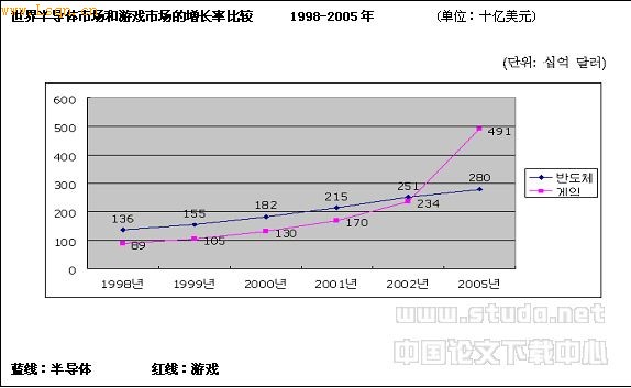 据统计,世界游戏市场将在2003年超越半导体市场规模,2005年游戏市场规模4,900亿美元,半导体市场规模2,800亿美元(见图1998-2005年:世界半导体市场和游戏市场的增长率比较)。