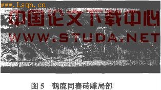 ”的环境中得到游目骋怀、怡然自足的雅兴。天津砖雕艺术注重对空间环境的渲染 ,达到掩映藏露,无画处皆成妙境的效果。对配景的刻画,亦考虑彼此关系上的照应,以形成统一的气韵。例如,图 5中的“鹤鹿同春”,其将动物与山水、建筑、植物进行有机组合,让整体构图穿插有序。鹤、鹿作为画面主体被放在主要位置,并用山水、建筑、植物将整体画面联系起来。画面比例适中,动静相生,其中水纹虽然是砖雕中的配景 ,但其所刻景物散淡飘逸 ,令人 回味,见图 5。  二、自然真挚的儒学伦理内涵 隶属于建筑装饰的天津砖雕艺术题材丰富多样、独具匠心,有人物 、花鸟、禽兽、虫鱼、回纹、八宝博古、书法以及各种吉祥图案等。其中以人物为主的题材有历史故事 、戏曲唱本、宗教神话、民族风情、民间传说和社会现实生活等,将人物场景表现得惟妙惟 肖,这是天津砖雕较为独特的一面。以动物、花鸟、图案为内容的题材,一般呈连续图样形式 ,或单独成为画面主题 ,赋予其以人格意义,表达人们 自己的理想品格和精神境界。民国后,砖雕意匠将皇家独有的龙凤形象带人民居之中,传递着吉祥寓意。