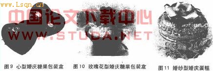 应把握好历史性与时代性的有机统一,只要这样才能体现出婚庆糖果包装的吉祥寓意性特色。 3.婚庆糖果包装的设计原则 科技的进步和包装材料的多样化,使现代婚庆糖果包装设计变得纷繁多样,不像早期简单的用红纸形式的糖果包裹。喜糖采用的包装材料种类繁多,印刷色彩丰富,如喜糖的包装材料有金卡纸、高档铜板纸、薄型的硬板纸、绸缎以及塑料。为把喜糖装饰得更加精美,丝带和木棒也被大量使用在包装中。包装工艺已有雕花、镂空等多种形式。从图形设计上看,不仅局限于民俗元素的运用,更多地弓i用了现代西方的婚庆图形。如心型、玫瑰花型、婚纱等图形作为元素来设计,把中国传统的民俗元素和现代消费心理结合,才能使现代婚庆糖果包装与民俗文化的完美融合。