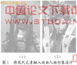 型等视觉设计元素相互借鉴。 1.将现代元素引入戏曲视觉符号的设计中 布袋戏源出传统戏曲,以生旦净末丑为主要艺术形象。在改革开放之后,我国戏偶的形象还引进了日本和美国的漫画人物、芭比娃娃、球形关节人偶,以及来源于电影、电视、动画片、博客、网络视频等媒介中的非主流艺术形象。但如果只是简单模仿时兴的媒体视觉符号元素,反而会丧失传统戏曲艺术的魅力和文化底蕴。所以,在求新求变的过程中,可在保留传统元素代表性符号的基础上,将现代元素引入戏曲视觉符号的设计中,使其更符合现代人的审美观。如图1把传统的戏曲人物(1)进行重新设计,融入现代网络动画中的艺术元素,就成为具有传统视觉符号却符合现代审美特征的艺术形象(2)。