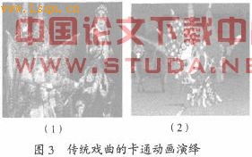 3.将传统戏曲视觉符号进行卡通动画演绎 FLAS日短片和3D动画这两种动画形式有别于传统手绘动画的细腻精致,由于其便于生产、造型夸张、色彩明快而成为更适宜在网络电视上观看的影像形式,较容易为现代传媒所接受。对比原版戏曲,动画制作的翻版戏曲在视觉元素上满足了观众对传统戏曲符号的怀念和尊重,对人物的夸张变形和简化处理更便于连续性、低成本的工业化制作。如图3(2)就是将传统戏曲视觉符号(1)进行卡通动画演绎的结果,艺术效果极佳。