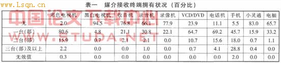 由此可见,新宾满族自治县虽然经济发展不很高,但是在以电视、手机、电脑等为代表的主要媒介终端配置方面,都达到了较高的水平。不过,除了彩电、VCD/DVD与手机拥有率较高之外,收音机、录像机与电脑拥有率都仍然较低,与发达地区相比,仍然存在着一定的差距。