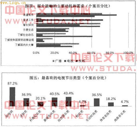 1.消遣娱乐是传统大众媒介接触的首要动机(参见图四:媒介接触的主要动机和需求)。这种接触动机的结构形态在对于电视节目类型喜好程度的调查中反映的也非常明显。在最喜欢的电视节目类型中,有87.2%的调查对象首选影视剧,这一比例远远高出其他节目类型,另外还有43.4%的调查对象次选综艺娱乐类节目(参见图五:最喜欢的电视节目类型)。所以我们也就不奇怪,在该地区居民闲暇时间进行的活动中,看电视就成了首选(参见图六:闲暇时间的主要活动)。这些都显示了媒介接触动机中强烈的消遣娱乐倾向。