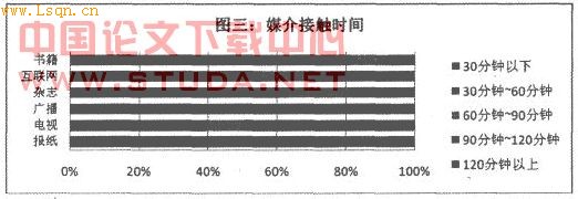 在媒介接触时间上,电视也是遥遥领先,每天观看电视超过2小时的比率达到35.9%;报纸、广播和书籍接触时间在30分钟以下的都超过了50%。而每天使用互联网超过2小时的调查对象也达到了17.3%,仅次于电视列第二位(参见图三:媒介接触时间)。