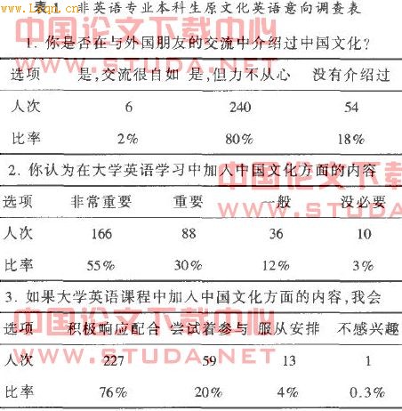 egrative)和工具性(instrumenta1)两大类。持融合性动机的人倾向于认可和接受目标语言文化,准备采纳并融入该文化的生活。而持工具性动机的人学习目标语言是为了某种较具体的实用目的,如研读论文、谋求职业、项目交流合作等。他们的研究结果表明,从总体上看,持融合性动机的学习者要比持工具性动机的第二语言学得好。 如果完全套用这一理论,那大学英语教学中似乎没有必要融人原语文化,然而事实却并非如此。笔者对本年级英语考试成绩排在前30名的学生的问卷调查及面谈的结果表明,只有三名学生(10%)在英语学习中持融合性动机,其余27名学生(90%)都明确表示学习英语主要是为了实用的目的,也希望能同目标语使用者进行各种形式的交流,但是他们并无对目标语文化的依附心理,也并不准备采纳该文化的生活方式。尽管所有学生都同意“对所学语言及其文化是否持开放、肯定的态度会直接影响语言学习效果”,他们也无一例外地认为“无法用英语介绍、宣传祖国文化直接导致他们语言交际中的挫败感、被动感”。